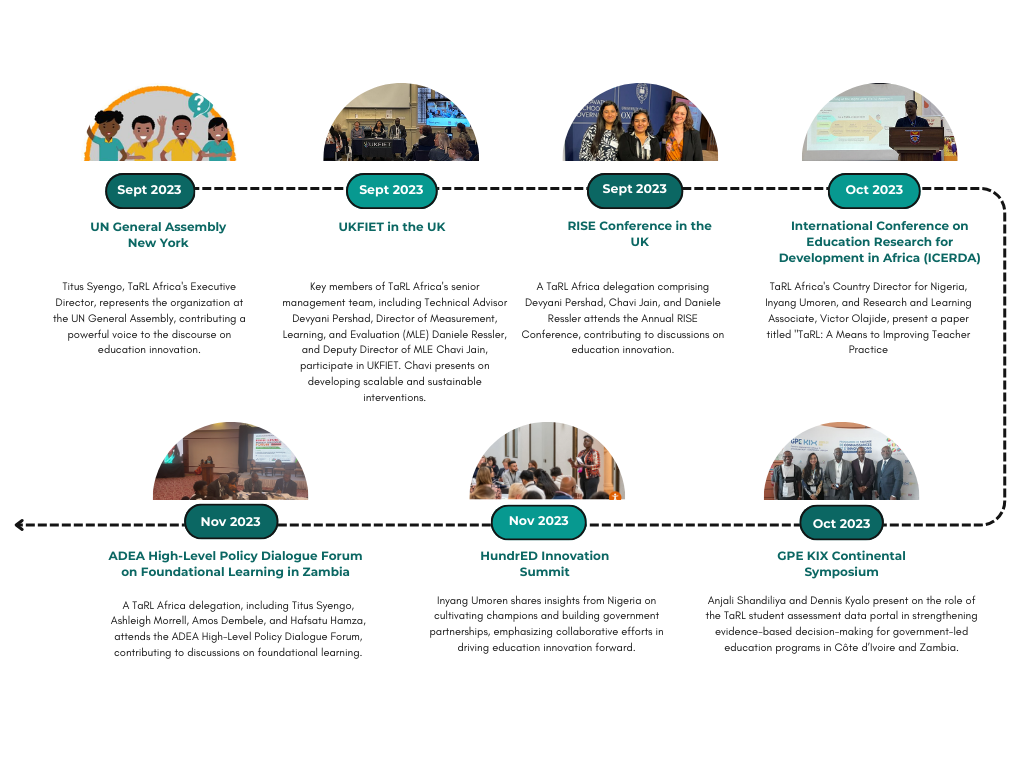 In the dynamic landscape of global education innovation, events, conferences, and summits have become important platforms for fostering conversations and collaboration. From New York to the UK and beyond, our dedicated colleagues seized opportunities to attend insightful events, contributing to advocacy efforts and knowledge-sharing initiatives. This blog documents the events that TaRL Africa team members actively engaged in throughout the latter half of 2023.